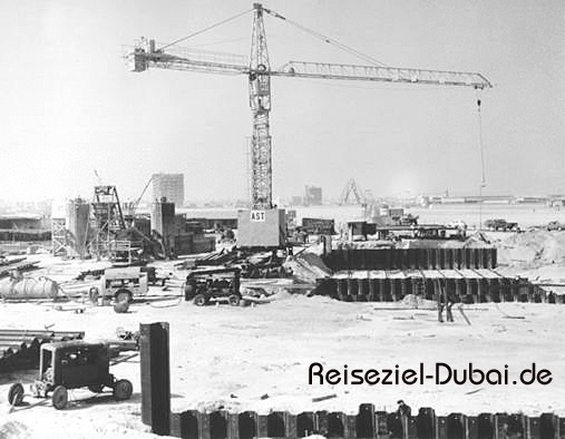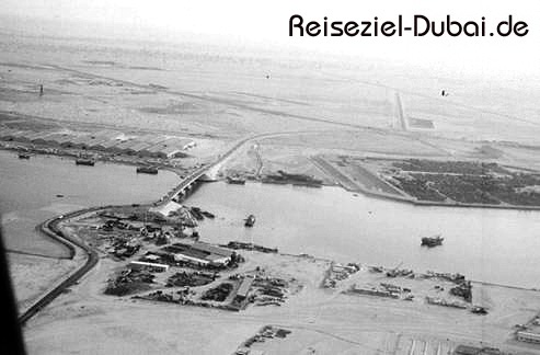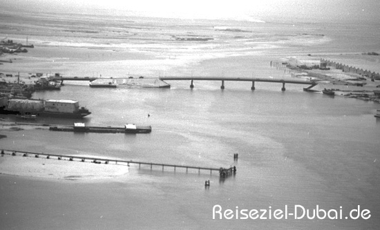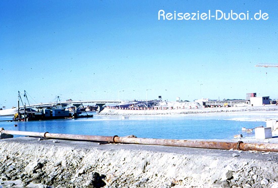 Deutlich zu erkennen: Die Umfahrungsstraße, die speziell für die Bauarbeiten angelegt wurde. Auf der Dubai-Seite sind links die Hallen des Zementlagers zu erkennen. Rechts erkennt man den Palast des damaligen Scheichs von Doha und Schwiegersohn von Scheich Rashid Al Maktoum. Im Hintergrund zu sehen, dass in Richtung Abu Dhabi noch alles Wüste war.