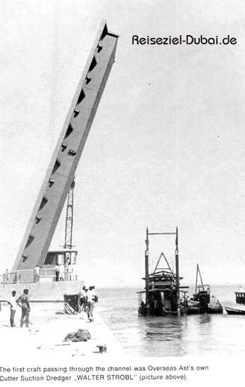 So führte ich mit dem Bauleiter unserer englischen Bauaufsicht ein Gespräch. Er wollte mir aber keine Fahrerlaubnis geben. Sein Argument: Es geplant sei, dass Scheich Raschid als Erster mit seinem Schiff die Brücke passieren sollte.