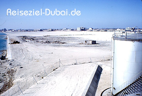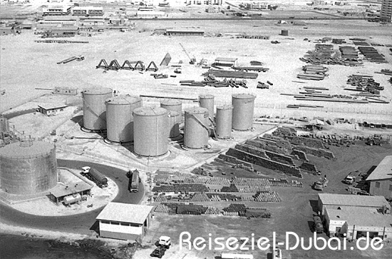 Das Shell-Tanklager befand sich etwa 300 Meter vor der Al-Maktoum-Brücke auf der Deira-Seite. Das Tanklager wurde von der "Overseas AST" im Auftrag der Firma Shell je nach Bedarf ständig erweitert. Die Bilder zeigen einen Rundblick auf die Tanks im Jahre 1965, und man kann sehr gut die damalige Bebauungsdichte erkennen. Die folgenden Bilder wurden im Uhrzeigersinn nach aufgenommen.