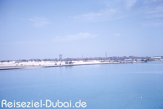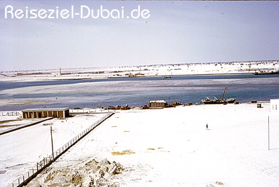 Im Hintergrund der Palast des Scheichs von Doha in Dubai. Im Vordergrund ein Landungssteg, an dem hauptsächlich Ölfässer entladen wurden.