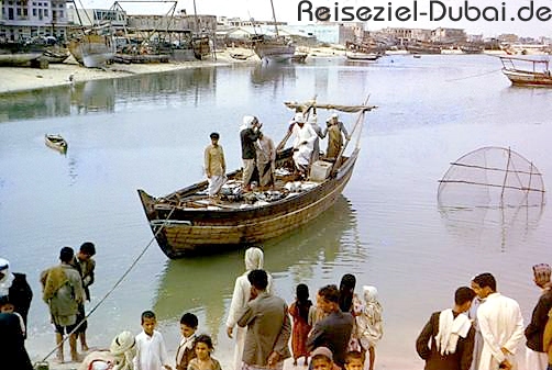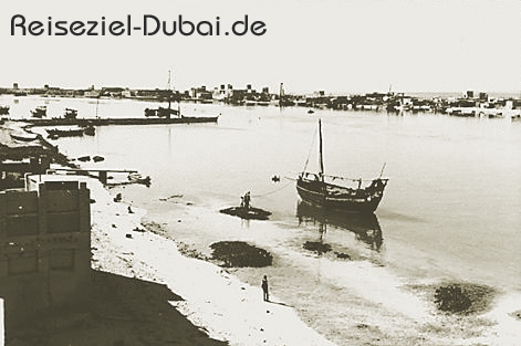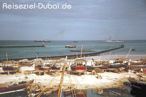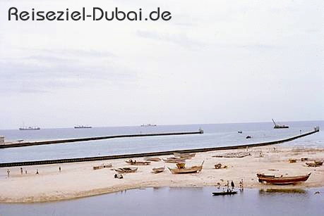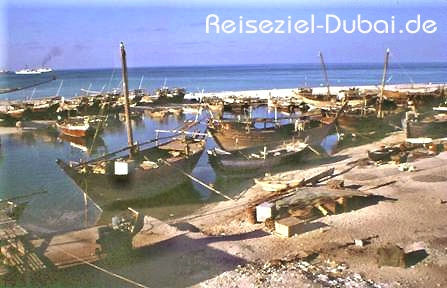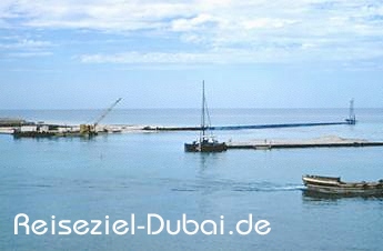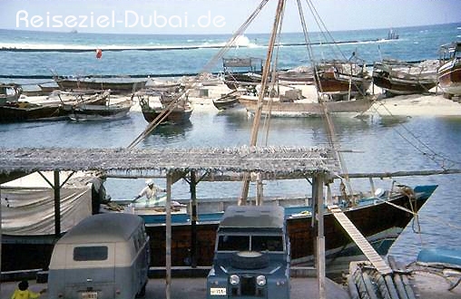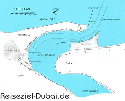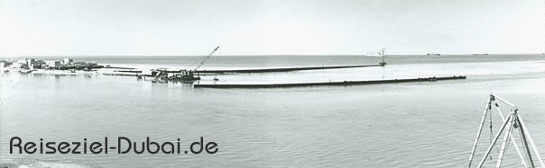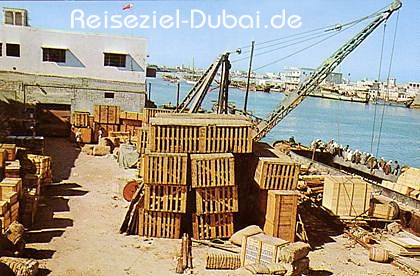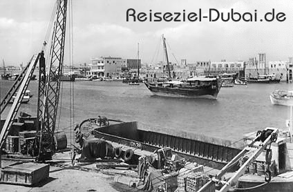 Bauarbeiten die für den Aufschwung von Dubai von großer Bedeutung waren Sheikh Rashid al Maktoum, der Herrscher von Dubai, wollte die Dubai-Stadt modernisieren. Dazu war aber eine Verbesserung der Einfahrt in den Creek und die Vertiefung der Fahrrinne von größter Bedeutung, denn die Dhaus konnten nur bei Hochflut vor allem das Mündungsgebiet und in weiterer Folge auch erschwert den Creek befahren. Eine mir bekannte Studie für diese Sanierung stammt aus dem Jahre 1953. Die Consulting-Firma "Sir William Halcrow" aus London hatte sie erstellt. Trotz dieser Hindernisse war Dubai für die Hochsee-Frachtschifffahrt die einzige Alternative. In keinem anderen Scheichtum, in den damaligen "Trucial States", konnten Hochseeschiffe auf hoher See be- und entladen werden, um die Waren an Land zu bringen. Deshalb bot es sich an, dass auch Waren für die anderen Scheichtümer in Dubai be- und entladen wurden. Dubai verlangte hierfürfür einen geringen Zoll, der dem Scheich zugute kam. Die Waren selbst wurden dann mit Dhaus oder Kamelen in die anderen Scheichtümer transportiert. Darüber hinaus gab es einen regen Waren-Austausch durch Dhaus mit den anderen Golfstaaten, dem Iran, Indien, Pakistan, Muscat, Jemen, Somalia und so weiter. Nicht zu vergessen das lukrative Schmuggeln von Gold, Silber und anderen wertvollen Waren, beispielsweise nach Indien und Pakistan und andere Länder.