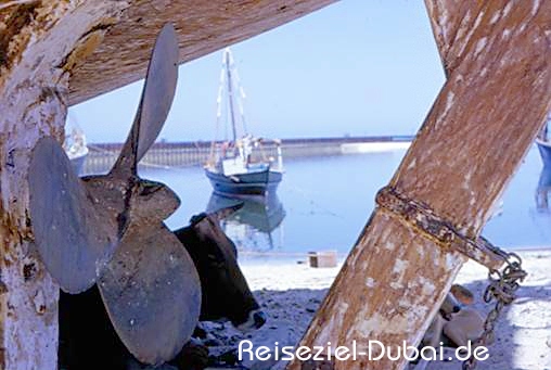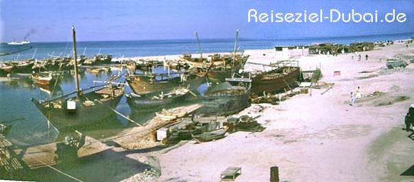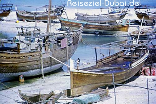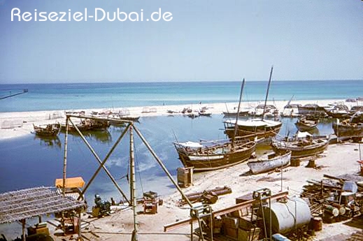 Blick vom Wassertank im Jahr 1964 in Richtung Creek. Blick vom Wassertank im Jahr 1964 in Richtung Wüste. Um den stetig steigenden Wasserbedarf zu decken, wurden gleich mehrere Tanks nebeneinander aufgebaut. Das Bild entstand nach 1975. Idyllischer Durchblick. Schiffschraube mit Dhau. Wartungs- und Reparaturarbeiten an Dhaus. Der Dhau-Hafen im Jahre 1965. Im Hintergrund sind englische Fregatten zu sehen.