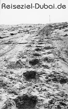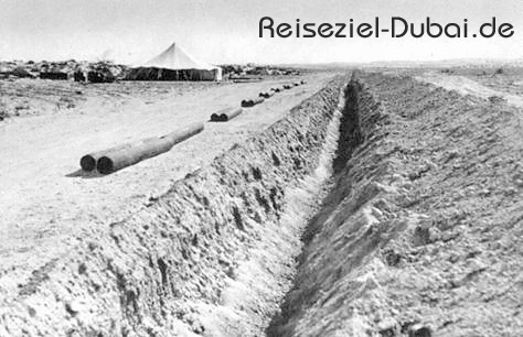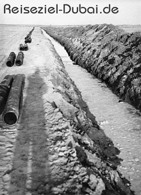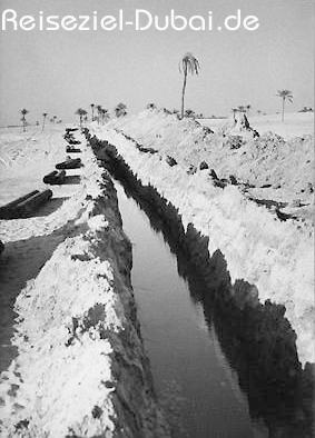 Die beschriebene Lagune und rechts der Fischmarkt von Deira im Jahre 1963. Das Bild ist aus zwei Bildern zusammengesetzt. Die Uferbefestigung und das Vertiefen des Creeks landeinwärts wurden ständig weiter ausgebaut. Einige spezielle Bauvorhaben wie das Erweitern des Zollgeländes wurde vorgezogen. Aber davon später. Dubai hatte zu dieser Zeit kein Süßwasser, weshalb schon 1960 eine Wasserleitung aus der Oase Al Wier geplant wurde. Diese hat der Schwiegersohn von Sheikh Rashid, der damalige Sheikh von Doha, finanziert. In Doha wurde zu dieser Zeit bereits schon Erdöl gefördert. 1961 wurde von der "Overseas AST" mit der Verlegung einer 38 Kilometer langen Wasserleitung begonnen. Die Brunnen selbst wurden von einer Spezialfirma gebohrt, die Pumpenanlage, die Wasserleitung und die Hochbehälter von der "Overseas AST". Bis Mitte 1963 gab es in Dubai nur Brackwasser, das in der Nähe der Küste aus kleinen gegrabenen Gruben geschöpft wurde. Mit Esel-Transporten wurde das Wasser dann in Dubai verteilt. Allerdings war das Wasser, das mit Kohlensäure behandelt wurde, für uns nur bedingt trinkbar.