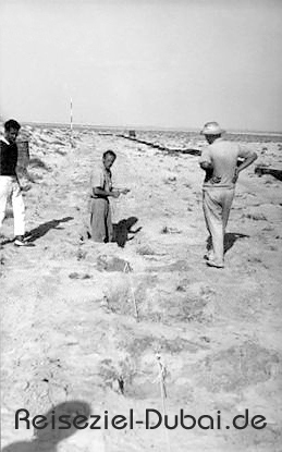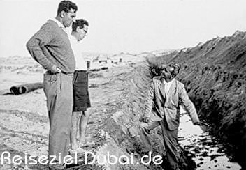 Die Sprenglöcher werden fachmännisch bestückt. Besprechung im Jahre 1961 vor Ort. Von links nach rechts: Diplom-Ingenieur Tschan, Ingenieur Tulloch, der Chef der Dubai- Wasserleitung, und Baurat Diplom-Ingenieur Walter Strobl von der "Overseas AST".