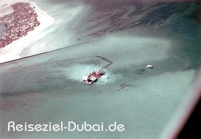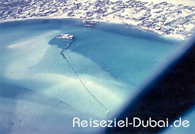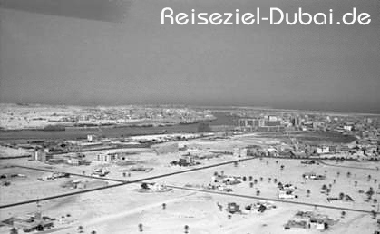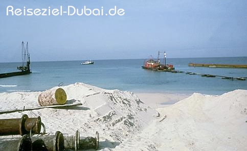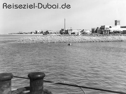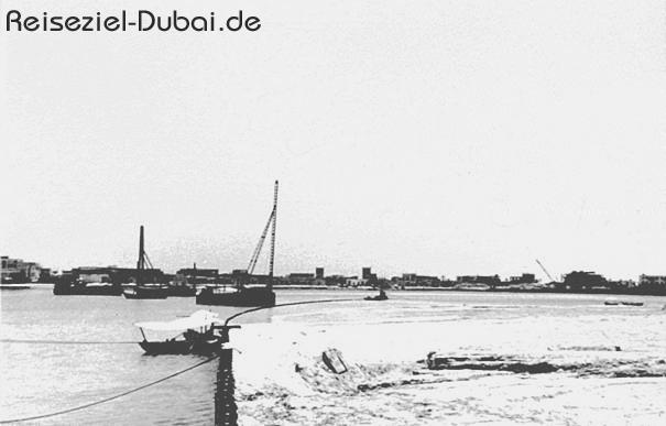 Auf diesem Bild von 1959 ist die Versandung des Creek deutlich zu erkennen. Der "Menk-Bagger 152" auf dem Ponton mit seiner angeschlossenen Kiespumpe vertiefte die damals vorhandene seichte Fahrrinne. Das ausgebaggerte Material wurde bis zu 500 Meter weit in seichte Stellen des Creeks gepumpt. Damit wurde wertvolles Neuland gewonnen, das vom Scheich zu horrenden Preisen verkauft wurde. So konnte er nicht nur die Rückzahlung der Kredite beschleunigen, sondern auch noch weitere Bauvorhaben beginnen. So sah die Creek-Einfahrt im Jahre 1964 aus. Nach dem sogenannten Durchstich entstand eine Sandbank in Form einer geschützten Lagune. In dieser Lagune wurden jahrelang Dhaus gebaut und gewartet.
