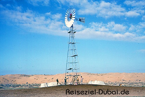 Mitten in der Wüste stand eine windgetriebene Wasserpumpe.