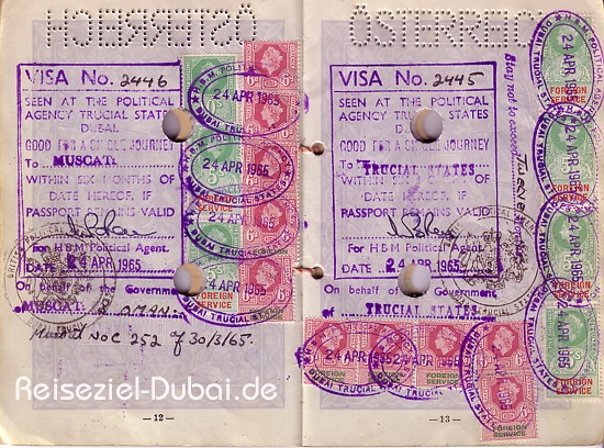 Am 24. April 1965 musste ich auf unsere erste Baustelle in Muscat. Oben links das Einreisevisum nach Muscat, rechts das Wiedereinreisevisum in die "Trucial States", also nach Dubai.