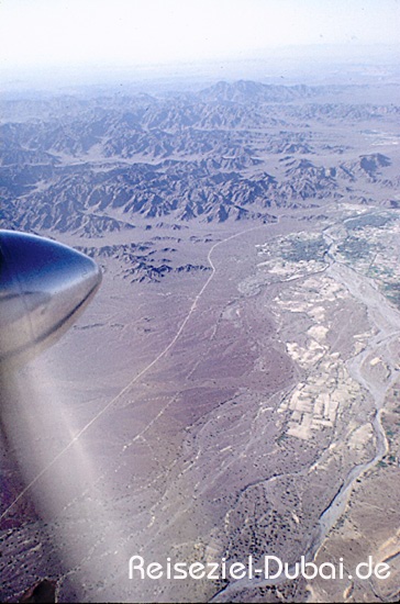 Die Aussicht war atemberaubend: schroffe Berge, tiefe Täler, in denen man, obwohl wir an die 3000 Meter hoch flogen, die Bewässerungsanlagen der Araber erkennen konnte, sogenannte Faladj-Systeme.