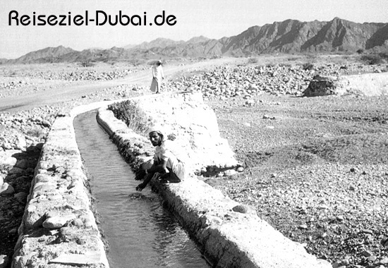 Diese Schächte wurden durch schmale Tunnel miteinander verbunden. Nach der Fertigstellung floss über viele Kilometer das Wasser aus den Bergen in weit entfernte Oasen. Auch die offenen Gerinne, "Falaj Ghayl" genannt, kurz vor den Oasen konnte man gut erkennen.