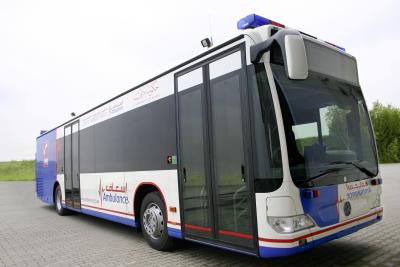 Gestern wurden drei neue Großraumrettungsfahrzeuge an das „Centre of Ambulance Services of the Government of Dubai“ übergeben. In Dubai kommt ab sofort das Krankenhaus zu den Verletzten. Angeschafft wurden die drei Mercedes-Benz-Klinik-Busse, um bei so genannten Großschadenslagen, also Unfällen oder Katastrophen mit vielen Verletzten, schnell medizinische Hilfe leisten zu können. Oft fehlt es auch an der notwendigen Anzahl von Krankenwagen. In den Mercedes-Benz- Großraumrettungswagen ist eine Versorgung von bis zu 20 Personen durch vier medizinische Fachkräfte gewährleistet. Die neuen Großraumrettungswagen bieten die einzigartigen Möglichkeiten einer voll ausgestatteten mobilen Klinik mit Intensivstation und Operationssaal. Den größte Krankenwagen der Welt gibt es in drei Varianten: Die Busvariante A ist eine intensivmedizinische Versorgungseinheit, Variante B ist für die Massenversorgung und den Transport von mittel bis leicht verletzten Unfallopfern vorgesehen, Busvariante C ist die Kombination der beiden vorhergehenden Fahrzeuge. Allein diese Variante bietet Behandlungs- und Transportkapazitäten für über 80 Patienten. Zwei Fahrzeuge sind zwölf Meter lang, ein Gelenkbus kommt auf 18 Meter. Wer nähere Informationen möchte, findet diese auf http://media.daimler.com/dcmedia/0-921-614216-49-1206800-1-0-0-0-0-0-11700-0-0-1-0-0-0-0-0.html. - Bildmaterial Daimler-Benz -