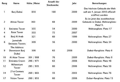 Die Liste der Hochhäuser in Dubai wird immer länger, und bekommt durch den „Burj Dubai“ noch das Prädikat des höchsten Gebäudes der Welt. Blickt man von dort oben aus einer Höhe von um die 800 Meter, dann sehen die anderen Hochhäuser eher wie Spielzeug aus, obwohl auch sie zu den höchsten Gebäuden der Welt gehören. In Zahlen Mehr als 55 Gebäude sind 180 Meter hoch oder höher, mehr als 45 Gebäude gar mehr als 200 Meter. Damit liegt Dubai hinter New York City und Hongkong schon heute an dritter Stelle der Städte mit den meisten Hochhäusern. „Schon heute“ heißt, dass sich Dubai, sollte auch nur ein Teil der Bauvorhaben bis Ende 2010 verwirklicht werden, bald den ersten Platz weltweit einnehmen wird, denn dann sollen insgesamt um die 80 Wolkenkratzer über 200 Meter die Skyline Dubais dominieren. Ob es so schnell wie geplant kommt, bleibt abzuwarten, aber die Zielvorgabe des Herrschers ist eindeutig. Gäbe es eine Rangliste von Wolkenkratzern die über 300 Meter sind, dann wäre Dubai bereits absoluter Spitzenreiter mit unglaublichen zehn Gebäuden. Zum Vergleich: Hongkong und Chicago haben lediglich „nur“ sechs. Doch an dem Tag, wenn der Burj Dubai feierlich eröffnet wird, werden neue Dimensionen der Öffentlichkeit zugänglich. Nach der Fertigstellung wird der „Burj Dubai“ offiziell das höchste von Menschen geschaffene Gebäude sein, das jemals auf der Erde gebaut wurde. Das zweithöchste Gebäude in Dubai ist der 68 Stockwerke hohe „Almas Tower“, der mit 363 Metern in die Höhe steigt. Er befindet sich in der Nähe der „Jumeirah Lake Towers“. Im unteren Bereich des „Almas Tower“ befindet sich auf 1500 Quadratmetern ein öffentliches Diamanten-Schauzentrum mit Verkaufsräumen. Kaum kleiner ist der „Emirates Tower“ mit 355 Metern, der sich an der „Sheikh Zayed Road“ befindet. Dieser Bau liegt derzeit an 19. Stelle der höchsten Gebäude der Welt. Ein weiterer Wolkenkratzer trägt den Namen „Rose Tower“, das vierthöchste Gebäude Dubais und das höchste aller Hotelgebäude der Welt. Die Wolkenkratzer in Dubai befinden sich größtenteils an nur zwei Standorten: An der „Sheikh Zayed Road“ und in der Gegend in und um „Dubai Marina“. Ein Rückblick Die Geschichte der Wolkenkratzer in Dubai begann mit dem Bau des 149 Meter hohen „Dubai World Trade Center“ im Jahre 1979 - zum Zeitpunkt der Fertigstellung das höchste Gebäude im gesamten Nahen Osten. Seit 1999 und insbesondere ab 2005 hat sich in Dubai mit dem Bau von extrem hohen Gebäuden einen Namen gemacht. Das Ergebnis ist unglaublich: Mit heutigem Stand kann Dubai mit 390 Wolkenkratzern glänzen, aber diese Zahl wird in naher Zukunft weiter erhöhen. Genaues weiß man nicht, aber man geht trotz der Krise davon aus, das heute um die 300 Hochhäuser im Bau sind und sich weitere 551 Hochhäuser in Planung befinden. Hier ein kleiner Auszug der höchsten Bauwerke Dubais. Was Dubais Hochhäuser ausmacht ist allerdings nicht nur deren Höhe allein, sondern sie sind allesamt geprägt von außergewöhnlicher und fantastischer Architektur, die man auf solch engem Raum nirgendwo mehr auf der Welt sehen kann.