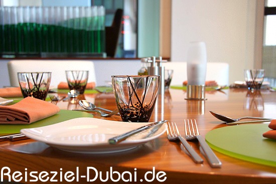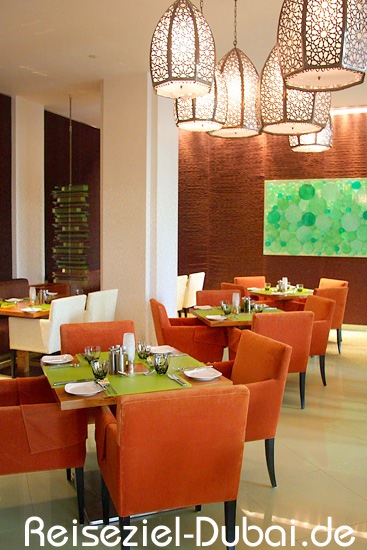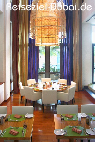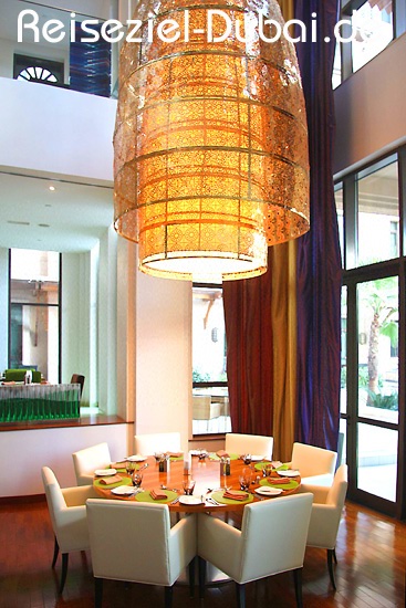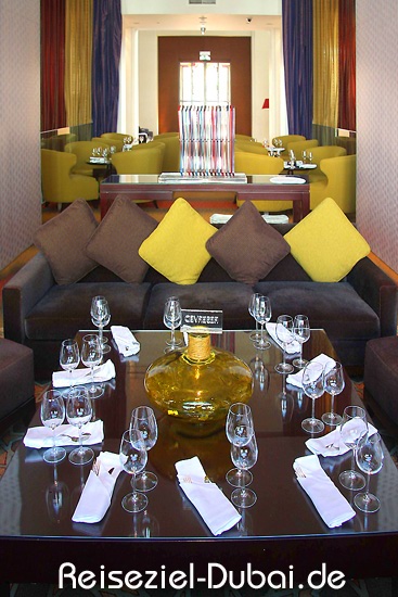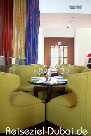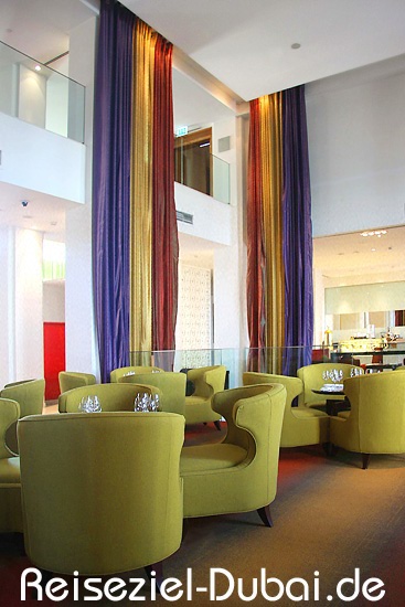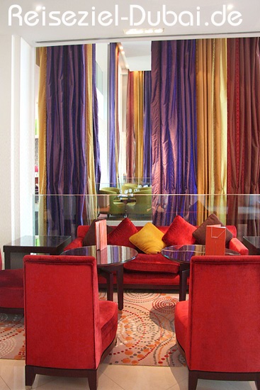 Das „Qamardeen“ im Detail In der zweiten Etage befindet sich die elegante „Lobby Lounge“, mit Sicht auf die Lobby selbst und auf die Rezeption. Elegante Teppiche mit arabischen Mustern, Sitzgelegenheiten, die in herrlichem Rot schimmern und über denen großen dunkelroten Lampen hängen. Die Sitzgruppen sind durch Vorhänge, Säulen und Glaswände unterteilt, wo den Gästen Gebäck und Snacks angeboten werden. Jeweils von Donnerstag bis Samstag werden nachts von 18 bis 21 Uhr spezielle Käse- und Wein-Spezialitäten serviert.