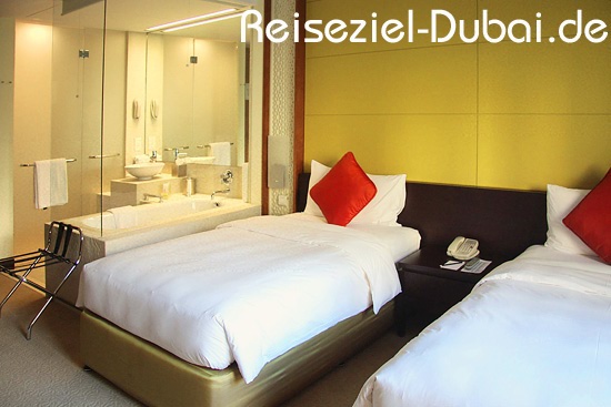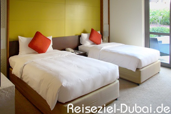 Standard Twin (Doppelzimmer) Unaufdringlich in dezentem Dunkelrot vermitteln diese Zimmer eine beruhigende, erholsame Atmosphäre mit arabischem Flair. Beste Betten im Schlafzimmer, das nur durch eine Glaswand vom Badezimmer getrennt ist, das mit Marmor-Boden und -Fliesen, zwei Waschbecken, einer stilvollen Badewanne, mit Vorhang, und einer separate Dusche und separatem WC ausgestattet ist. Alle Zimmer verfügen über eine kleine Terrasse mit Tisch und zwei Stühlen sowie direktem Zugang zu Pool oder Garten.