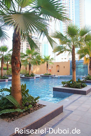 Der Pool des „Qamardeen“ Direkt hinter dem „Esca Restaurant“ befindet sich im Freien der „Swimmingpool“, der mit kleinen Palmen umsäumt ist, mit einem Wasserfall und einem wunderschönen Landschaftsgarten. Für die Badegäste stehen ein Umkleideraum, Duschen und Handtücher kostenlos zur Verfügung. Und nach dem Bad kann man sich mit Getränken und Snacks aus dem „Esca“ verwöhnen lassen. Wer noch mehr für seine Fitness tun möchte, kann dies im modernen Fitness-Bereich in der sechsten Etage des „Qamardeen“.
